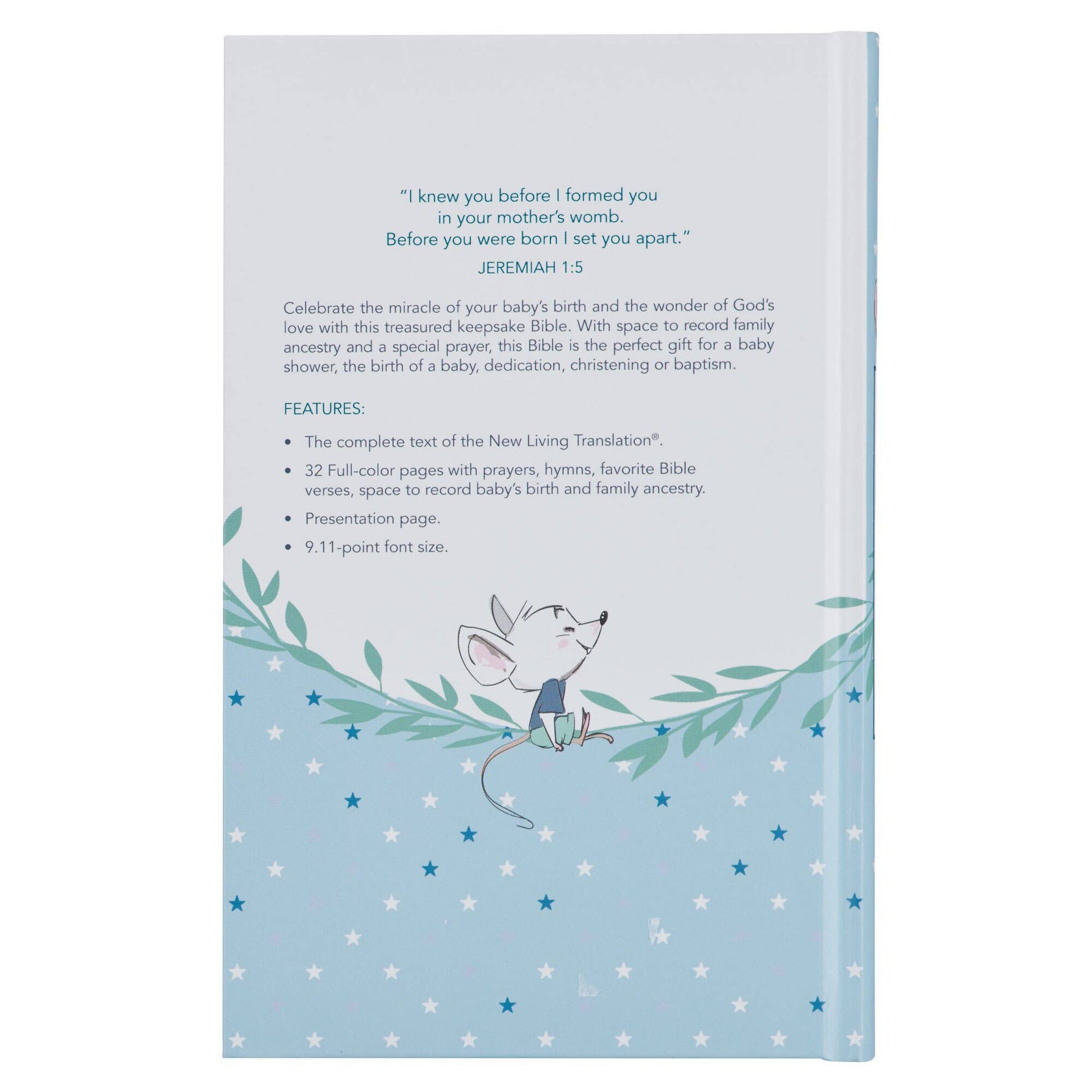 Screen-printed elephant design, Blue embossed screen-printed title and version reference, Hardcover, New Living Translation, Satin ribbon marker, Text printed in black, 9.11-point font, 1064 pages, Presentation page, 32 full-color page with hymns, prayers, and Bible memory verses, Pages for family tree, birth, baptism, or christening details, Prayer or mom and dad, Double-column format, Lay-flat Smyth-sewn binding, Packaged in a full-color printed gift box, Size: 8.8" x 5.6" x 1.2" (224 x 142 x 30mm)