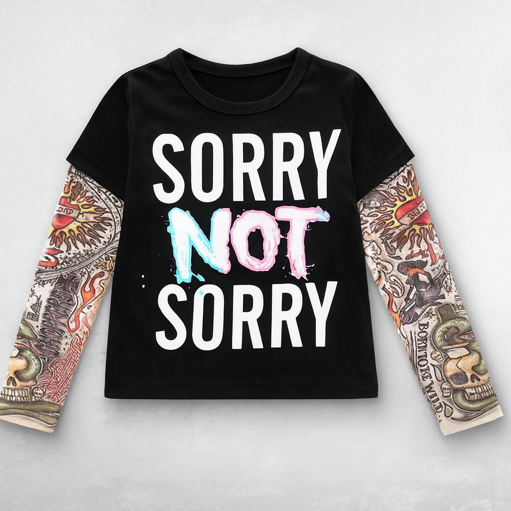 Black “SORRY NOT SORRY” Tattoo Sleeve Unisex Kids T-Shirt