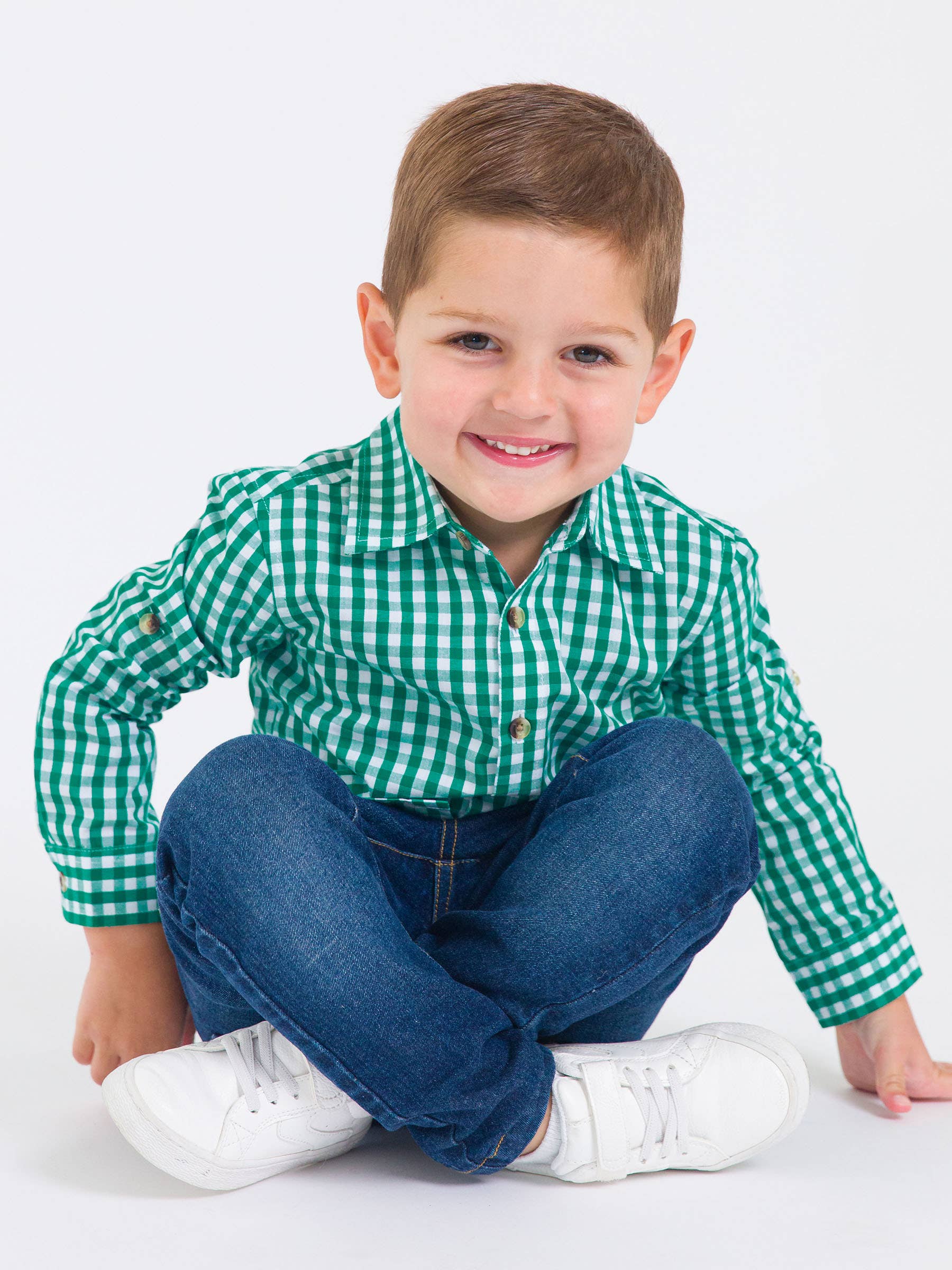 Boys Classic Emerald Green Gingham Long Sleeve Button Down Shirt
